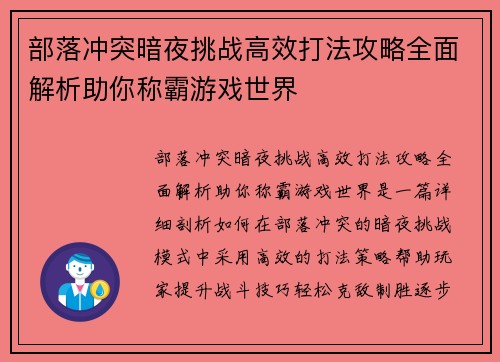 部落冲突暗夜挑战高效打法攻略全面解析助你称霸游戏世界