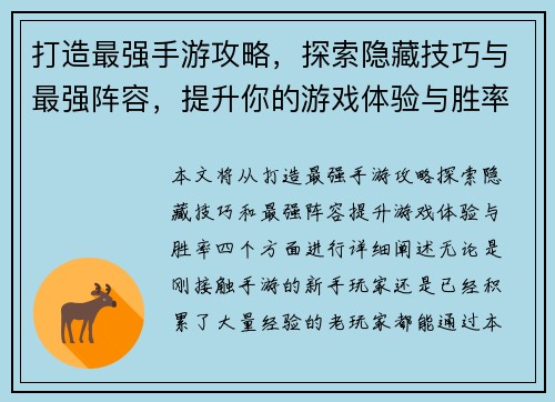 打造最强手游攻略,探索隐藏技巧与最强阵容,提升你的游戏体验与胜率